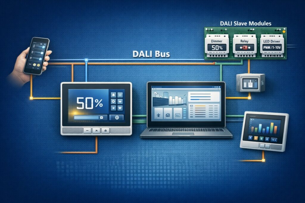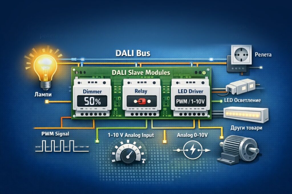 Реализират директно командите по DALI линията – управление на лампи, димери, релета и други товари. Поддържат DALI, PWM и аналогови входове (напр. 1-10 V).
