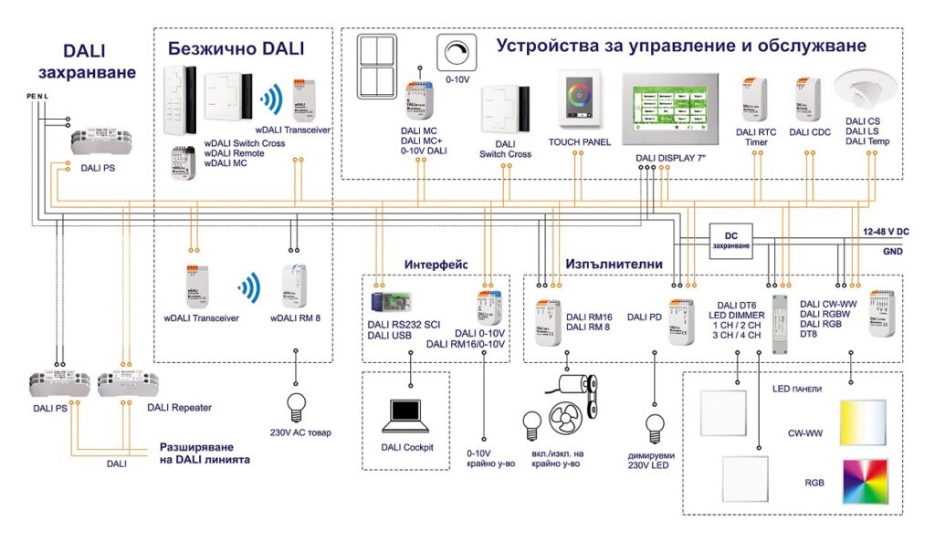 DALI концепцията е отворена към нови приложения и позволява реализация на проекти от различен мащаб – от единични помещения до сложни осветителни инсталации с множество кръгове.